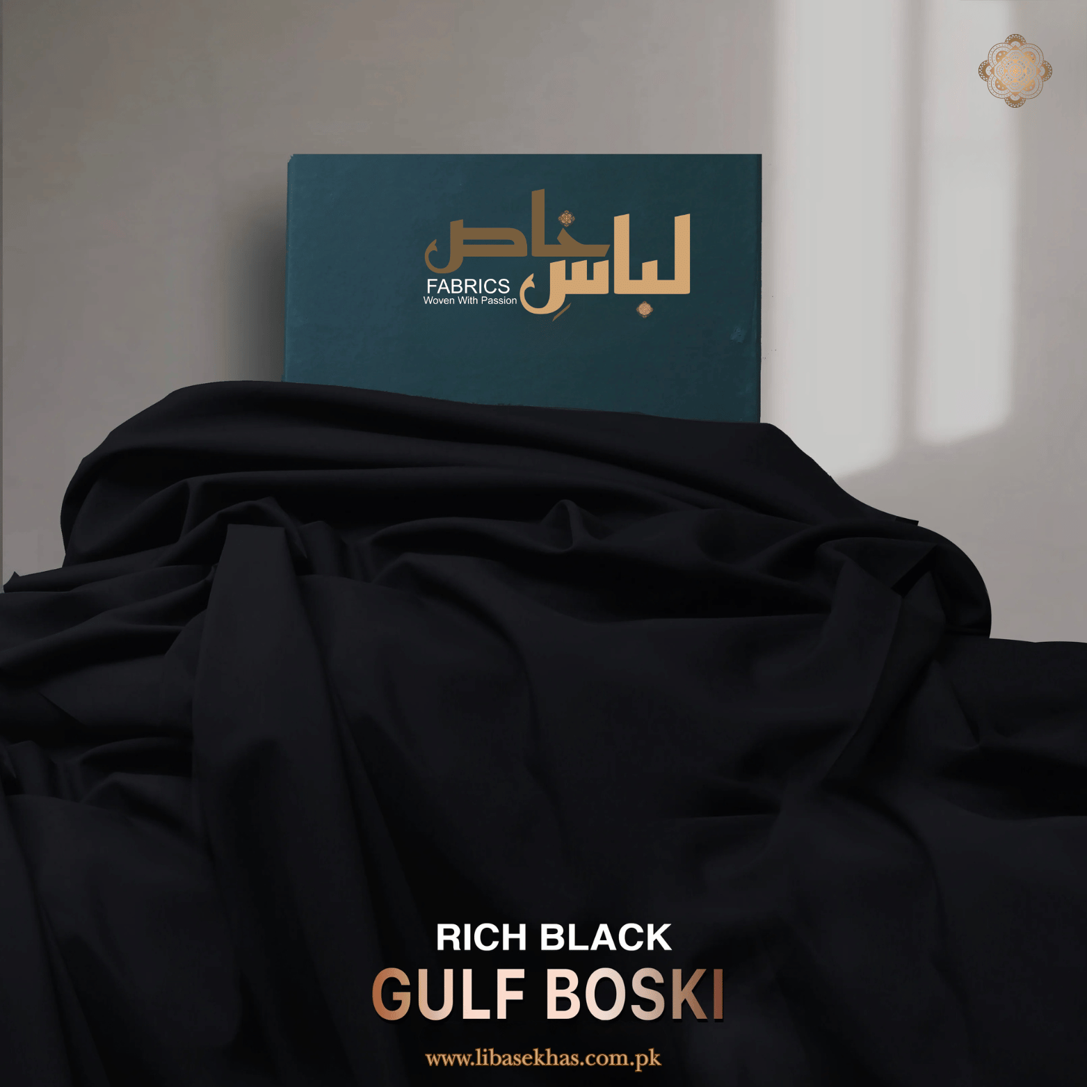 Make a bold statement with Rich Black Gulf Boski Fabric, exclusively by Libas e Khas. This premium 4-meter unstitched suit is crafted with fine Boski weave that ensures unmatched softness, smoothness, and durability.